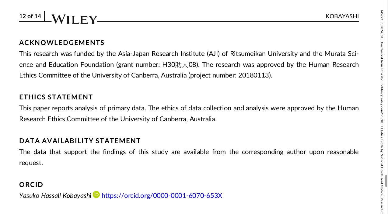 さらに、小林教授の単著である2024年論文にはキャンベラ大学(オーストラリア)の研究倫理手続きをとった旨の記載がある。